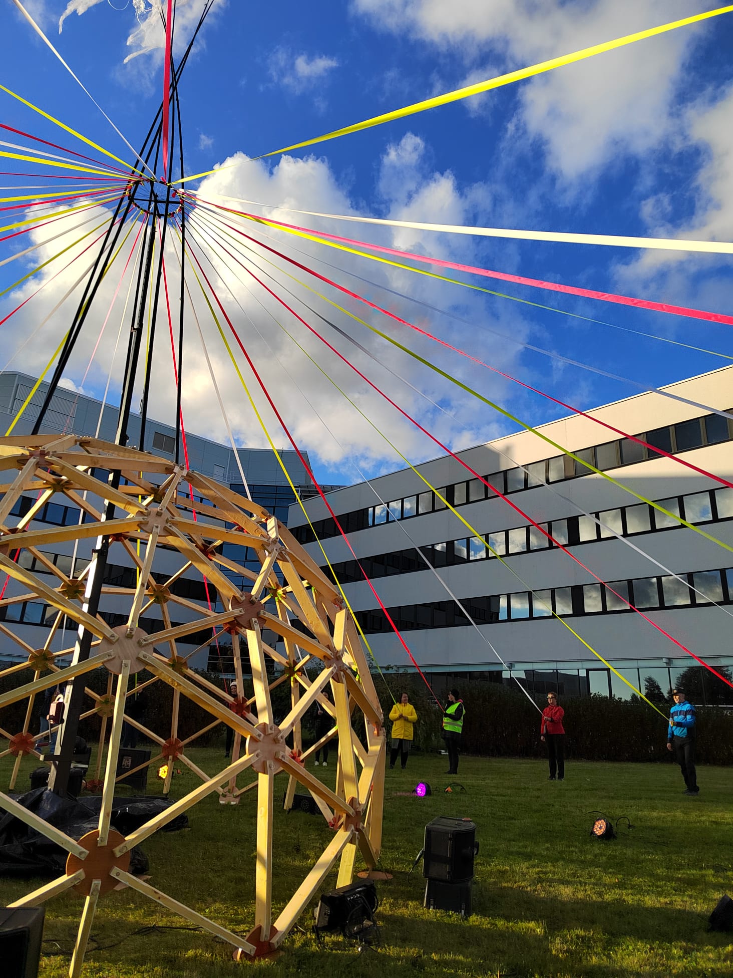 After a few setbacks due to custom delays at the port, the main travelling Beacon of Hope structure landed safely in Jyväskylä, and artist Craig Morrison was able to begin the setup with the local team to build the dome frame. Following this, a “ribbon weaving dance” workshop took place with 40 local participants. The artwork would not exist without this essential element of local participation for weaving the top section.