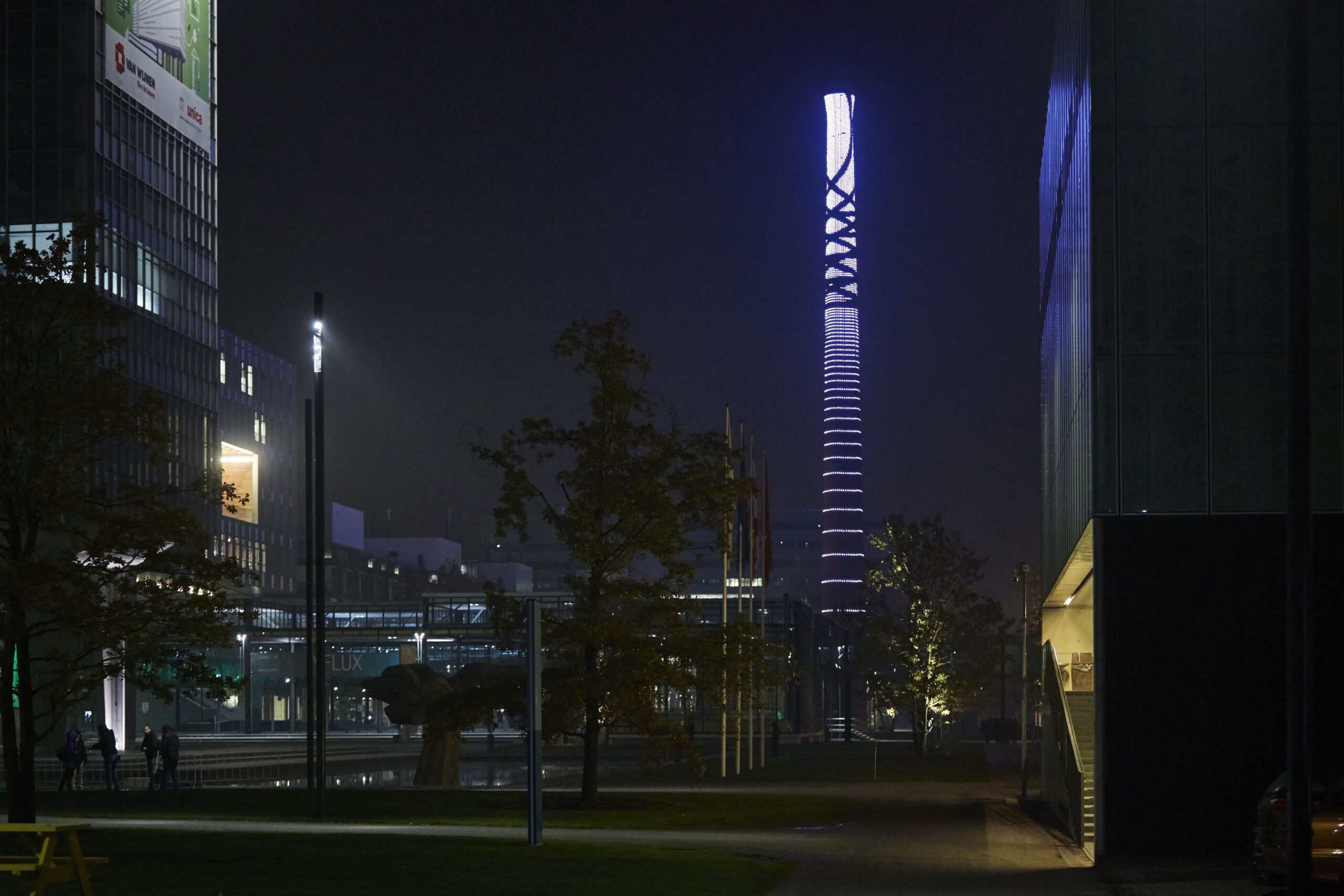 Light installation AnTUenna consists of ample 10,000 LED lights attached to the chimney at the ‘groene loper’ of the University of Technology campus. These LED lights generate red, green and blue light and are individually controlled in colour and intensity by a central controlling system. These light points are grouped around the chimney in rings of 60 LEDs each. It starts with a 15 centimetres’ distance between the upper two rings to be increased up to a distance of several metres between the two lowest rings. Horizontally, the distance varies between 14 and 32 centimetres. And owing to this specific division, a conic, low resolution screen appears which depicts images, videos and animations to be seen at great distance.