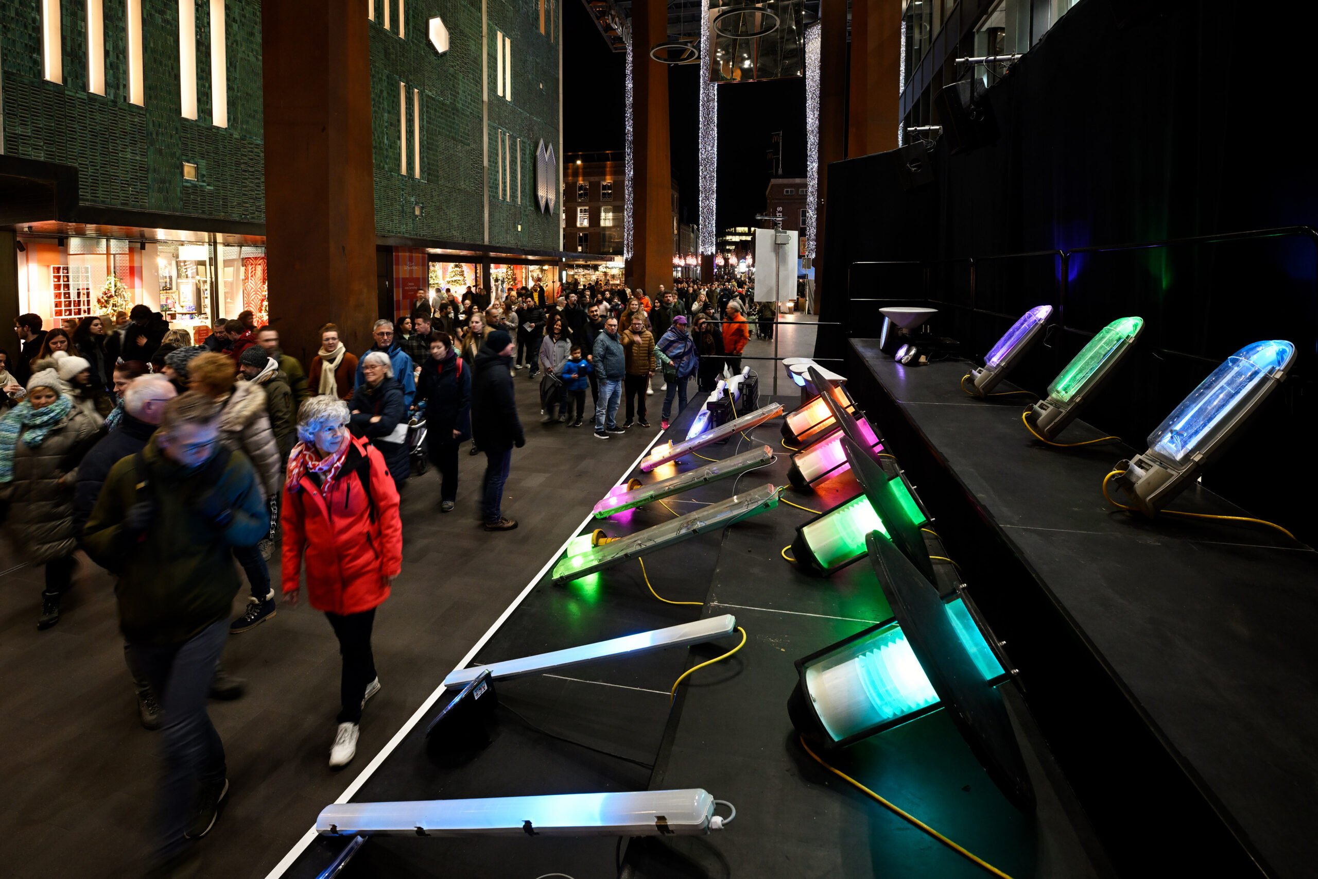 Under the roof of the Piazza, used lighting fixtures are given a second life in a swinging setup reminiscent of a Big Band. The fixtures, which were on the verge of being demolished, once made us feel safe on the streets and helped us find our way. They illuminated our streets, bike paths, traffic roads, and sports fields, or served as traffic or orientation lights. But now, they stand together in a band to make you, the visitor, dance.