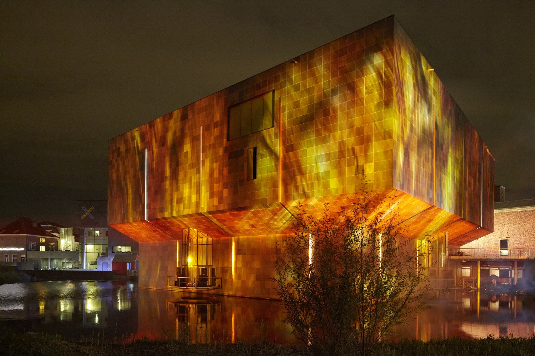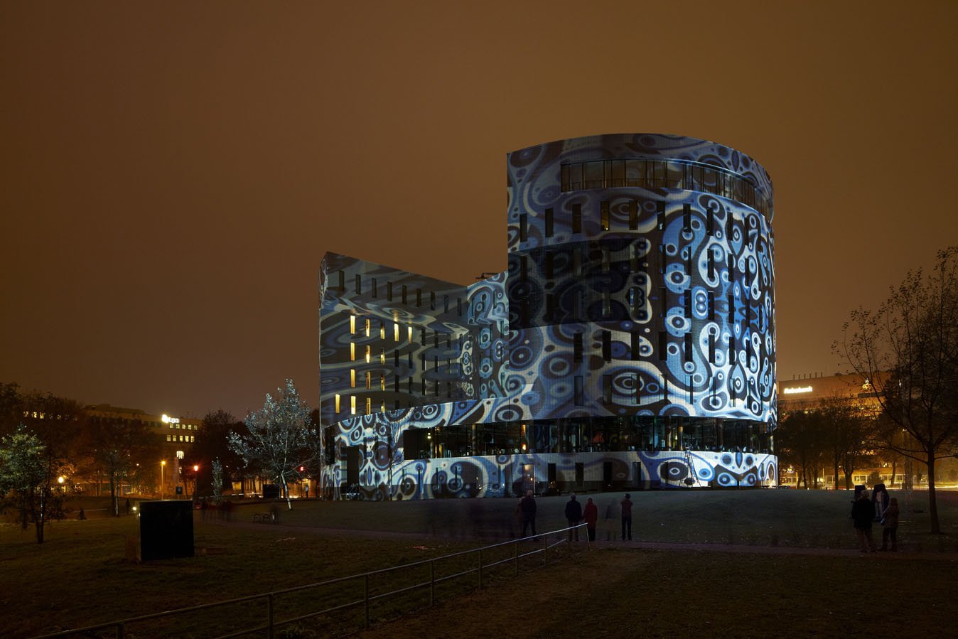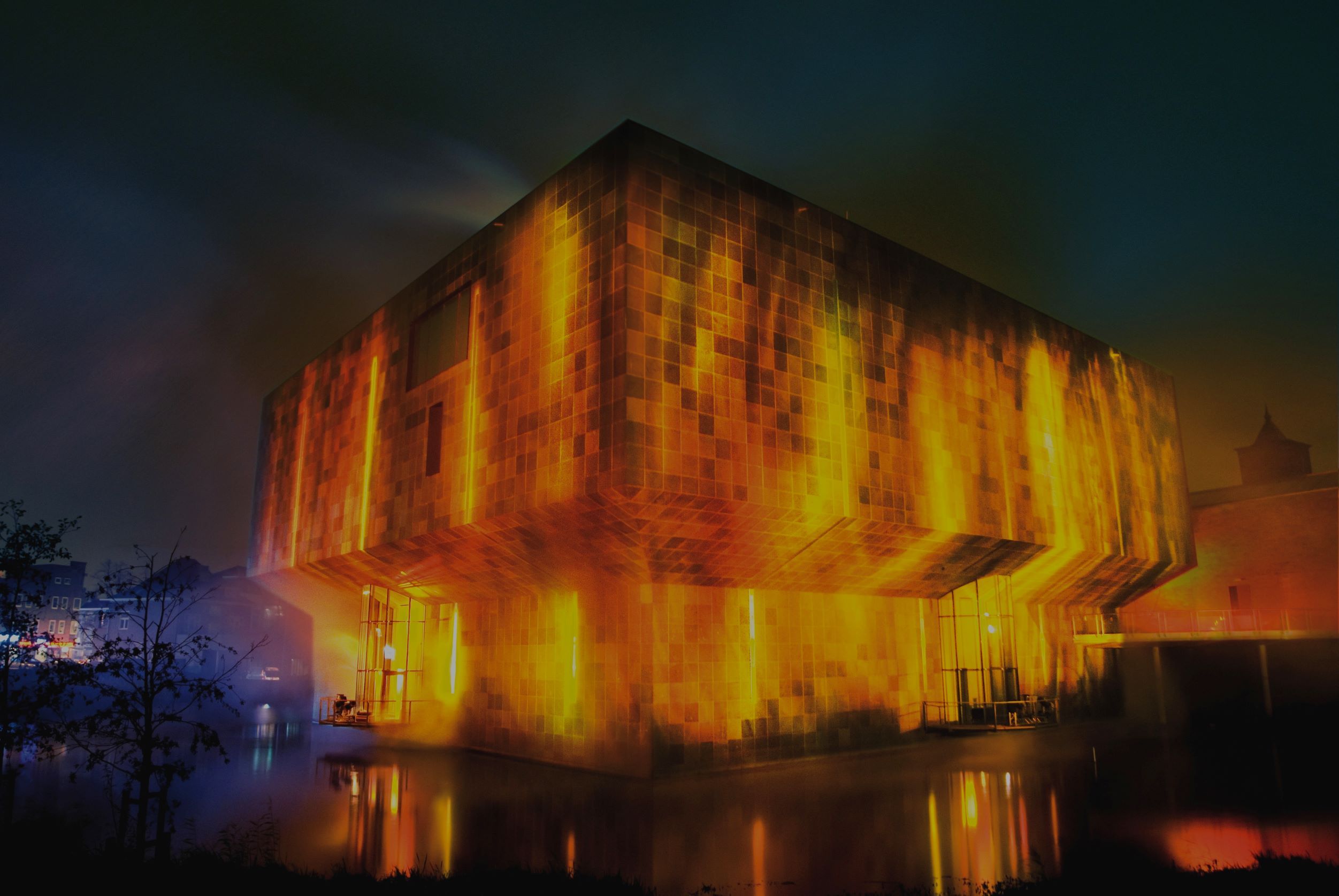 On the outer walls of the Van Abbemuseum, a projection was displayed, suggesting that the building was catching fire and soon to be engulfed in flames. The projection was accurately tailored to the shape of the building, making the museum’s actual structure disappear, and the fire illusion appeared lifelike.