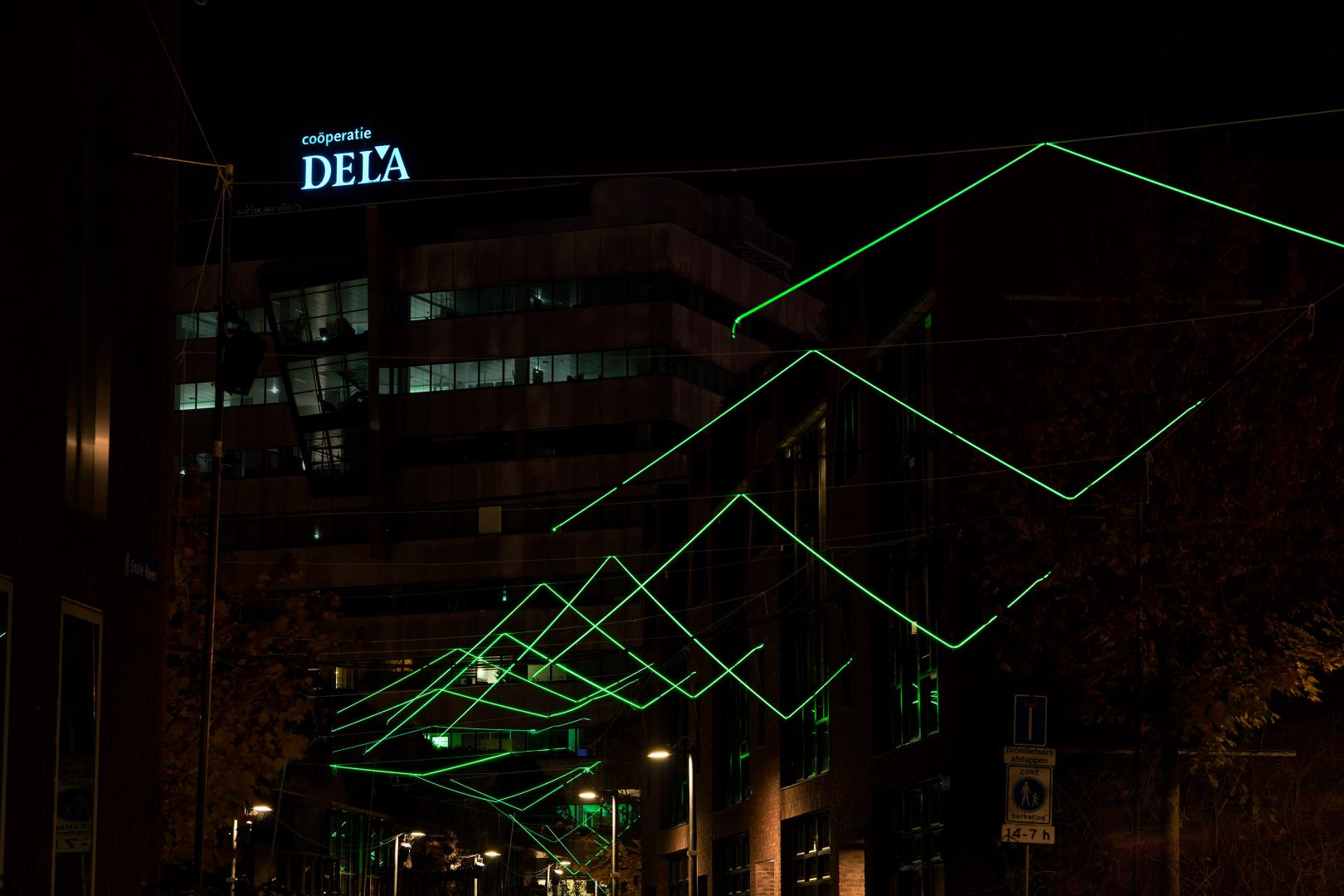 The bird is created by illuminating fiberglass strands that have been strung above the street. They have the shape of a bird, a bird just as children draw one. One by one the strands light up, which lends movement to the drawing. This happens so quickly and in consecutive order that the light lines suggest movement. This is in fact ‘stop-motion’ animation. Loudspeakers reinforce the feeling that a bird is actually passing overhead. In this light installation technology comes to life.