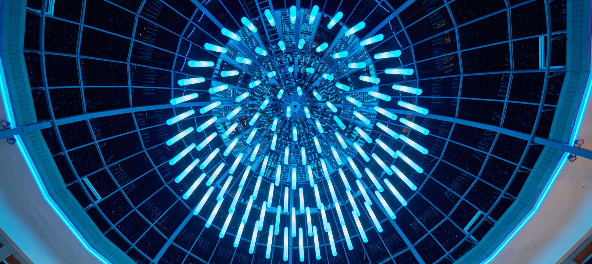The program, which runs on a central computer, controls all the light effects and tube movements. The movements and light effects, which are directly generated by the tubes, are reflected back by the glass panels in the dome to create a lively play of moving color patterns. The perceived shape of the different reflected patterns changes as the visitor changes position under the light sculpture