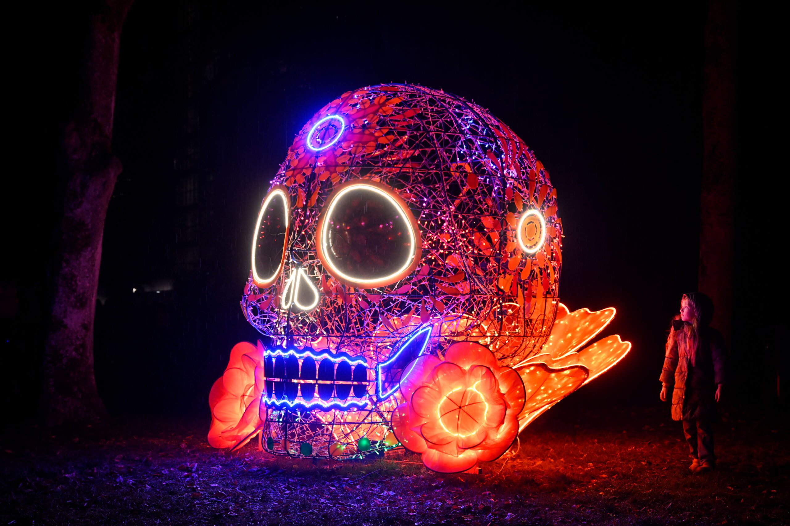 The four meter tall blue skull framed by a lush orange flower can be seen from far away. Flor de Almas (Flower of Souls) is a traditional Mexican Día de Muertos skull that glows like a beacon in the night. With this work, Trafficlight of Mexico Art Collective shows us what their Day of the Dead is truly about: celebration, remembrance and above all reflecting on the continuity of life.