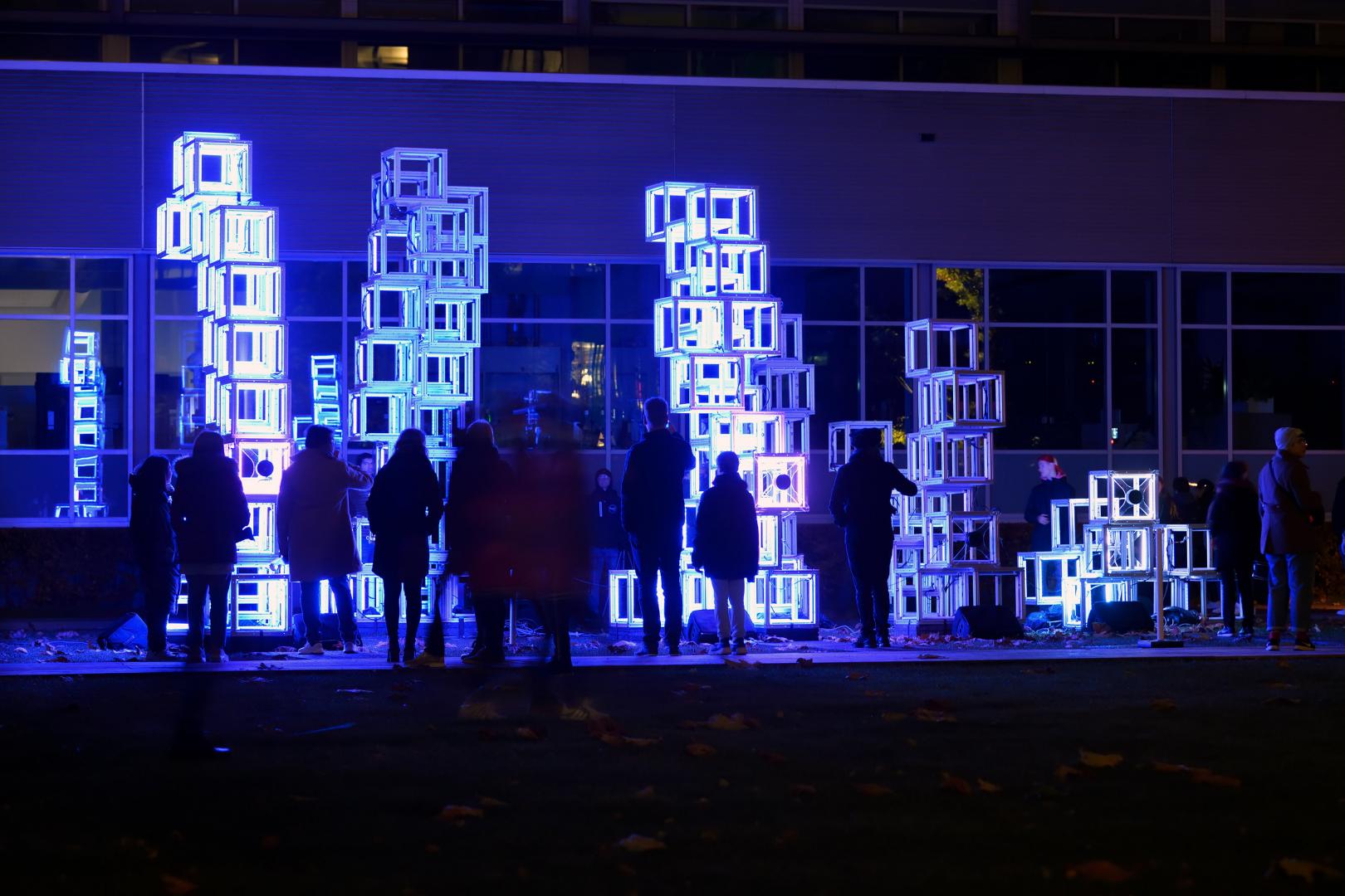 With this interactive light installation, Hypar Collective visualizes the journey of growth. When starting your journey, there is no clear coherent path that you can follow, which is shown in disordered and unconnected pieces of the installation. The expanding size of the installation represents how several smaller elements all contribute to growth. Visitors are able to activate these elements by interacting with the installation, making them a participant in the network that sparks personal development. When visitors have mastered the separate elements and reach the highest point of the installation, they are invited to look back at their growth process so far. The unconnected pieces now form a coherent shape, in which the separate elements visually contribute to the achieved goal. By using anamorphosis, Hypar Collective symbolizes its own growth as a team. In 2018 the team showcased her first installation, Loop, at GLOW Eindhoven. When looking back at the installation an outline of Loop can be spotted.