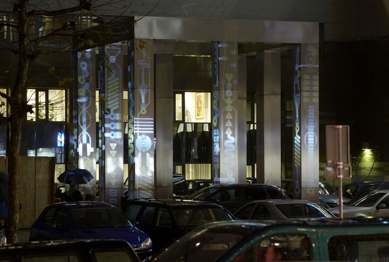 To counterbalance this static, ordered environment, Mr. Beam opted for a dynamic installation with round and natural forms. The exterior of the construction is entirely covered with projections. Small mechanical and organic forms move across the surface of the pillars, seemingly passing energy to each other, creating a flow of light and color that knows no beginning or end.