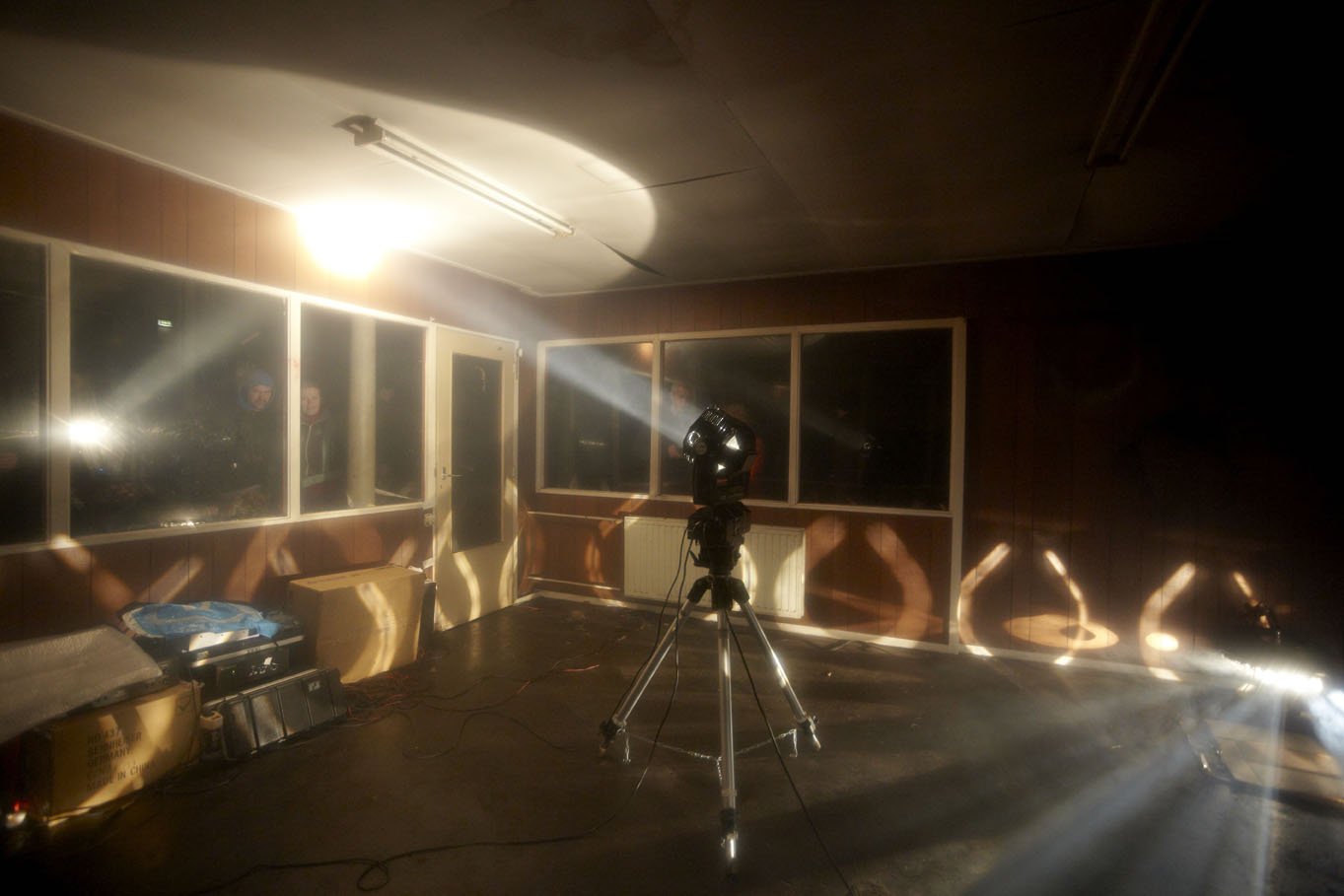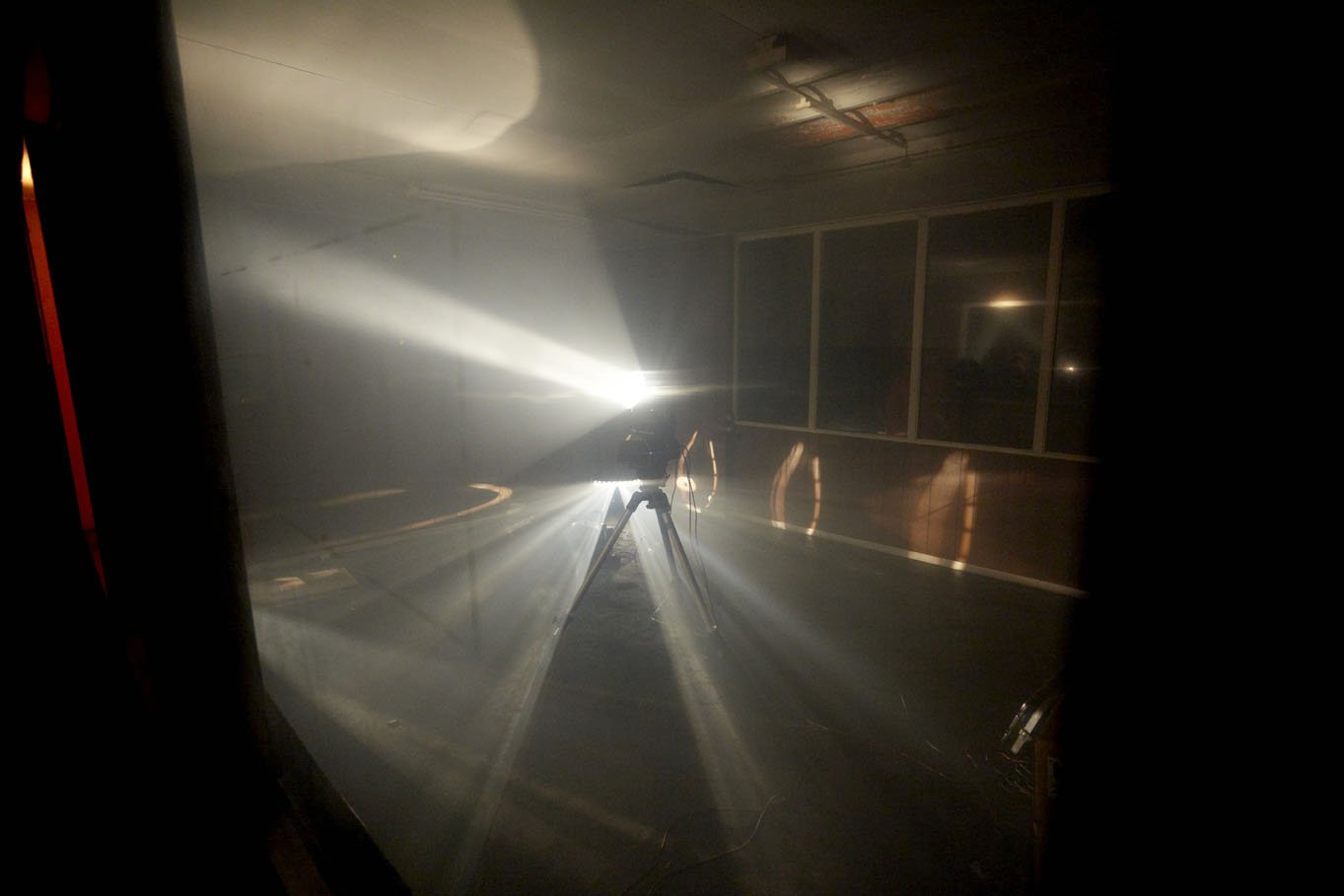 In an office of the Lucifer Factory, a bright searchlight is placed, which displays the window frames of the room as large shadows in the surrounding hall. In this hall, now used as a parking garage, sounds can be heard resembling the hum of cars occasionally mixed with street noise. Familiar sounds for this place, but they only stand out when presented in an unusual setting like this.