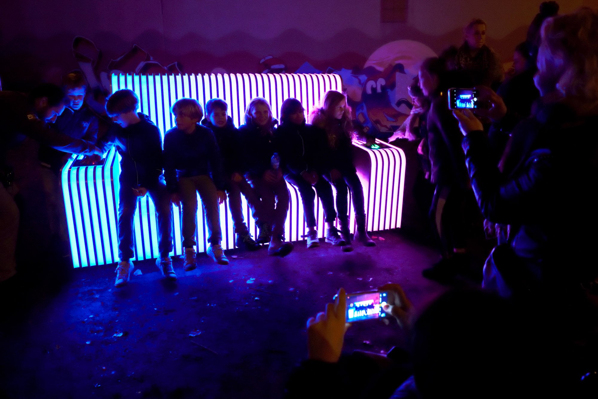 Does this work look familiar to you? That’s possible! This design by six students from Fontys Engineering was first shown at GLOW 2018. In 2019, the work returned once more. Vena Lumen literally means “heartbeat light.” This installation makes eleven thousand lights dance to your heartbeat, beneath you, in the bench. What feeling does it give you?