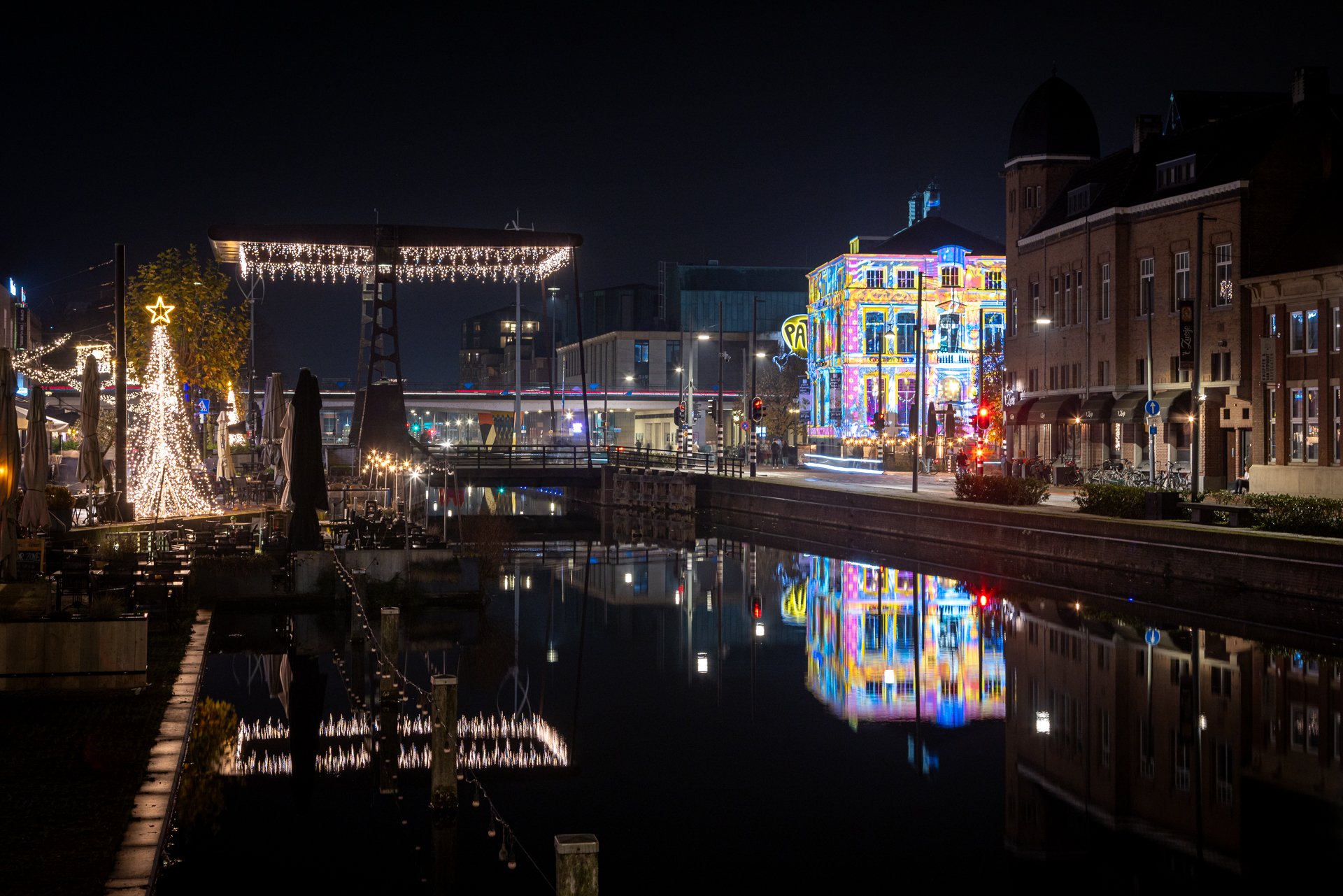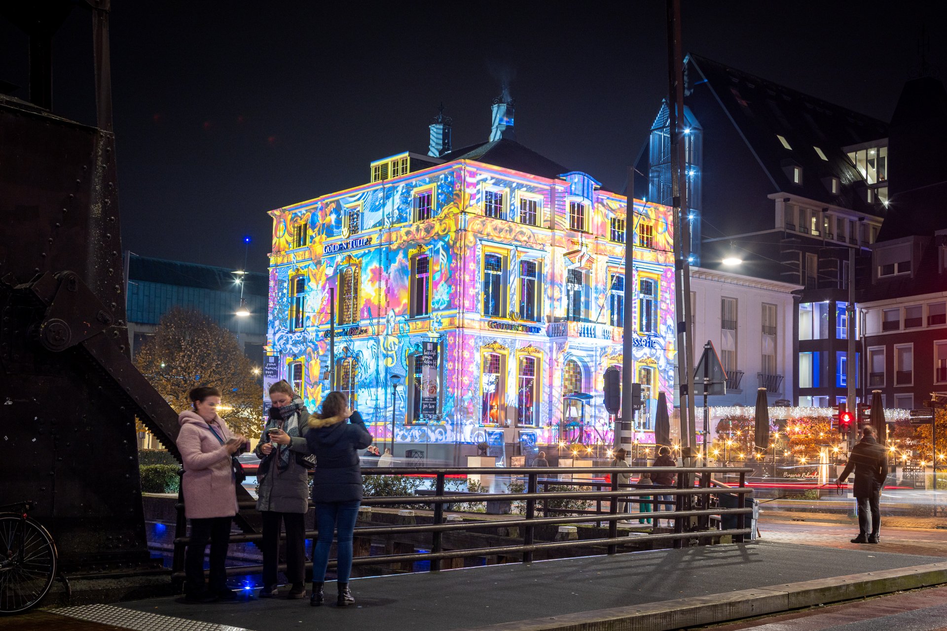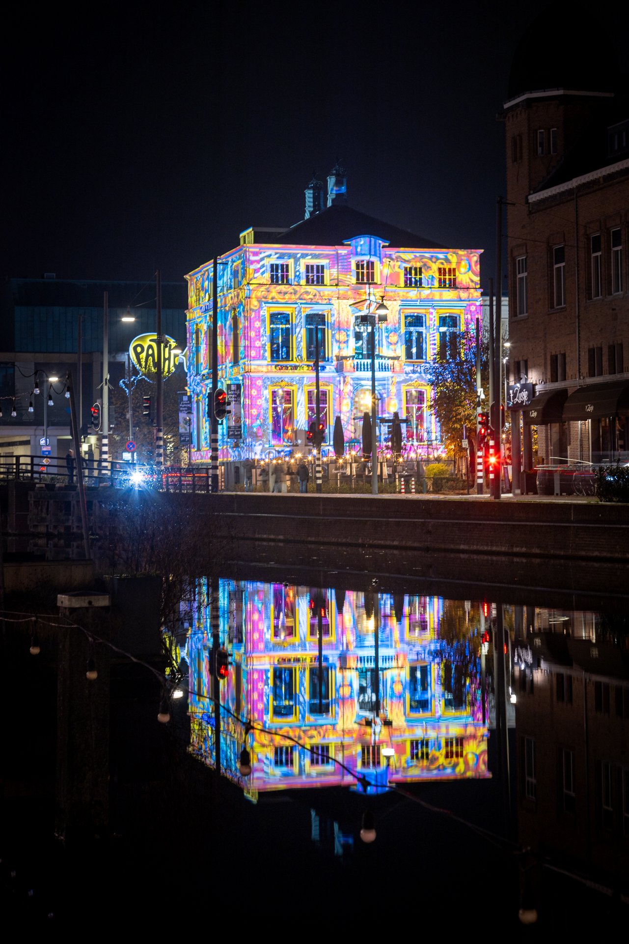 Als een trots baken van licht torent Bright Night Melody uit boven de huizen, kantoren en winkels. Met een zogeheten PANI-projectie verbeeldt kunstenaar Daniël Margraf kleurrijke verhalen op het hagelwitte Hotel West Ende in Helmond. Het zijn enorme dia’s op dit deftige pand als basis.