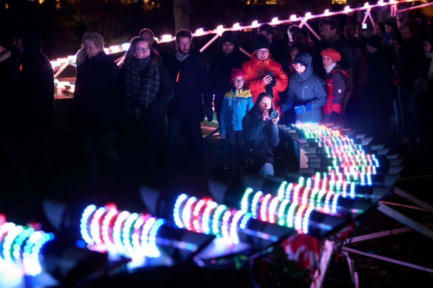 Crowd Cloud maakt dit deels inzichtelijk door je zintuigen te prikkelen met behulp van licht en geluid. Dit uit zich in verschillende kleuren die tot leven komen door middel van interactie met het publiek.