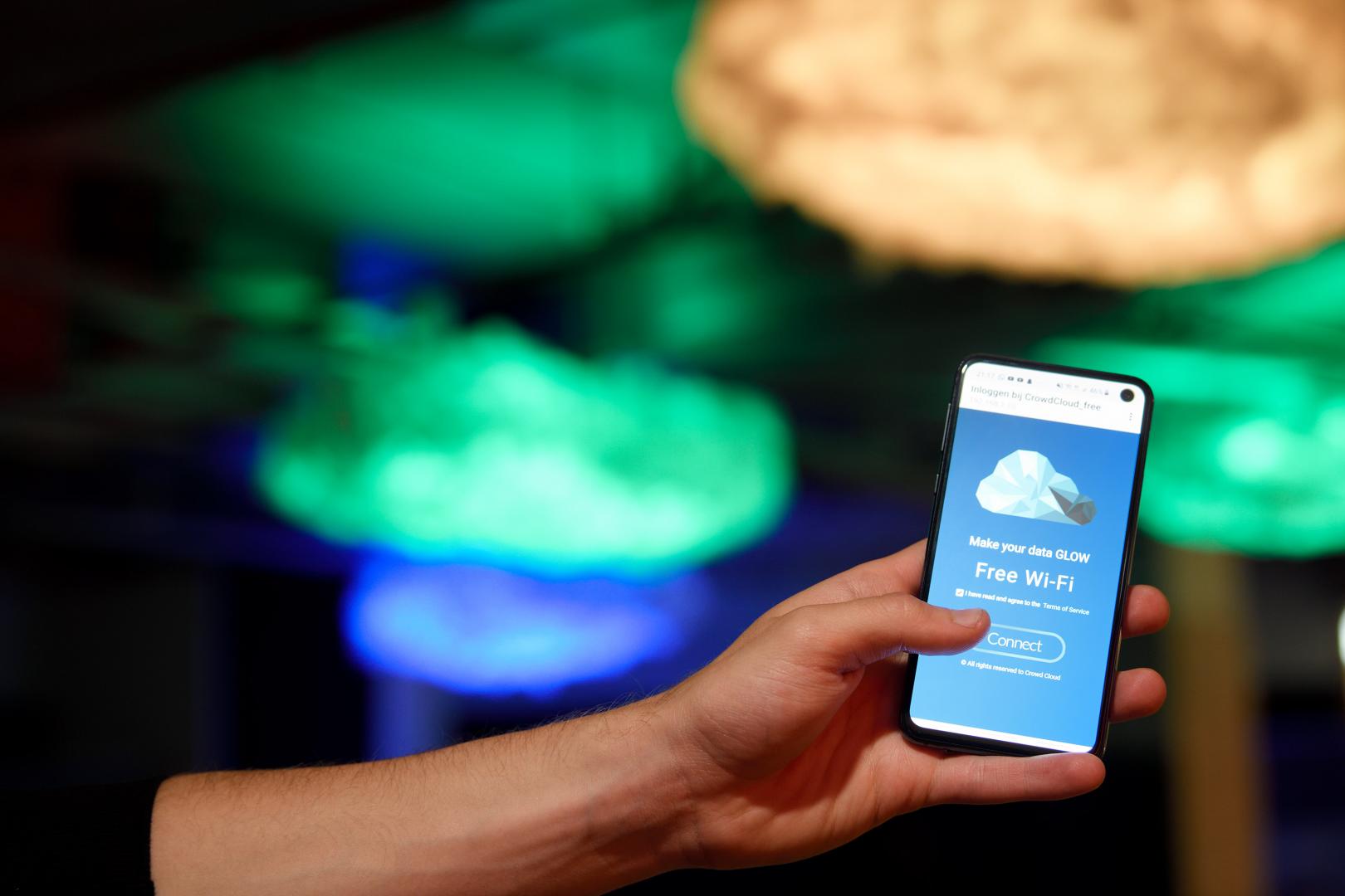 5 studenten van Fontys ICT werkten speciaal voor GLOW aan deze onderzoeksvraag in een van de GLOWlabs. Met het lichtkunstwerk Crowd Cloud willen zij bewustwording creëren over de gevaren van het gebruik van openbare wifi netwerken.
