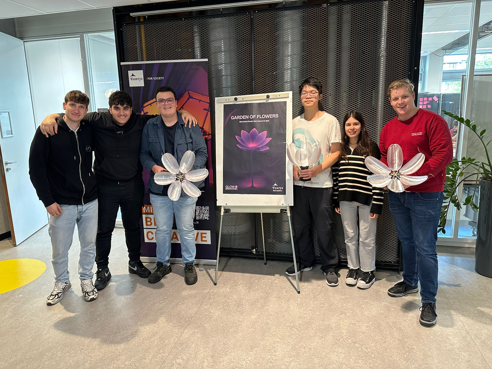 Dat is dan ook precies de dynamiek die Garden of Flowers visualiseert. Een grote bloemvormige installatie hangt onder een lamp. De structuur bestaat uit één centrale bloem, met daaromheen dertig kleinere bloemen. De bloemblaadjes openen zich langzaam en voorzichtig. Nadat de grootste opent, volgen de kleinere. Eén voor één ontluiken ze, als een vloeiende golfbeweging. Eerst zijn de bloemen in het midden aan de beurt, daarna volgen de bloemen aan de rand. Het licht van boven kust het kunstwerk als het ware wakker.