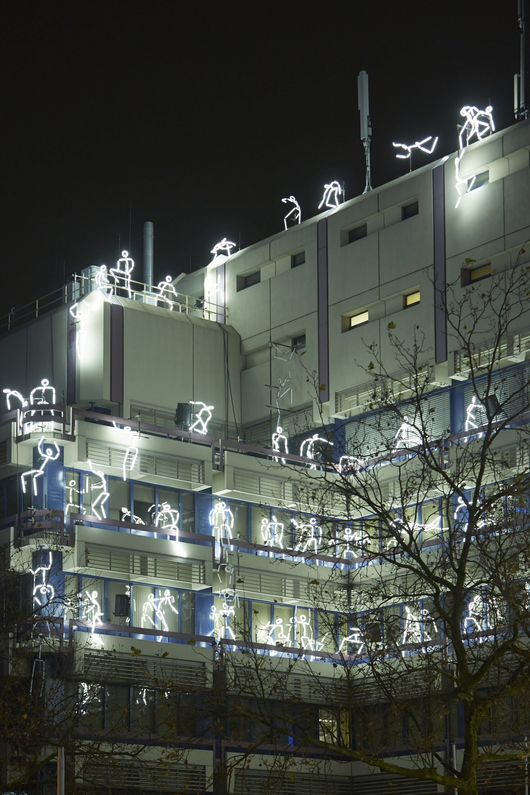 Tientallen mensfiguren in verschillende houdingen, opgebouwd uit LED-buizen, lichten één voor één op. Doordat steeds een andere figuur te zien is, wordt de suggestie van beweging gewekt. Elk figuur markeert een moment in een nachtelijke vertelling of dans. Een soundtrack die speciaal voor deze installatie is gecomponeerd begeleidt de lichtbeelden.