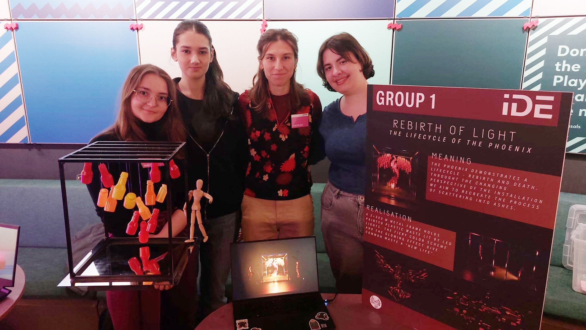 In hun lichtinstallatie verbeelden de studenten een feniks, gemaakt van plastic afval. Om het te zien, moet je wel wat moeite doen. Loop om het kubische frame heen. In eerste instantie zie je vooral stukken plastic die daar willekeurig bungelen. Totdat je de juiste hoek te pakken hebt. Daar is het. De feniks, in vol ornaat. Driedimensionaal en warm verlicht door LED-lampen. Wanneer je verder loopt, verdwijnt de feniks weer en lijk je opnieuw te kijken naar enkel plastic afval aan een frame.