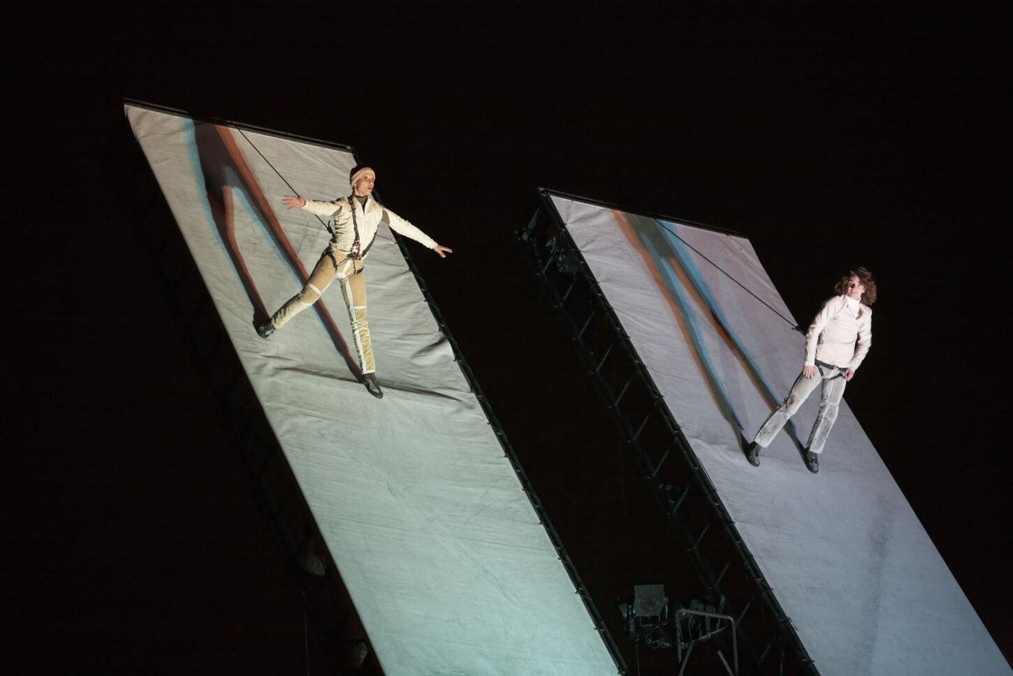 De bewegingsvrijheid van de acteurs is beperkt, doordat ze eenvoudig naar beneden kunnen glijden. De houdingen die ze aan kunnen nemen hebben echter een groots effect. Ze refereren aan de geboorte en aan thema’s als strijd en berusting, gevangenschap en bevrijding, groei en ondergang. Als in laboratorium kijken we naar het menselijk leven in zijn meest elementaire vorm.