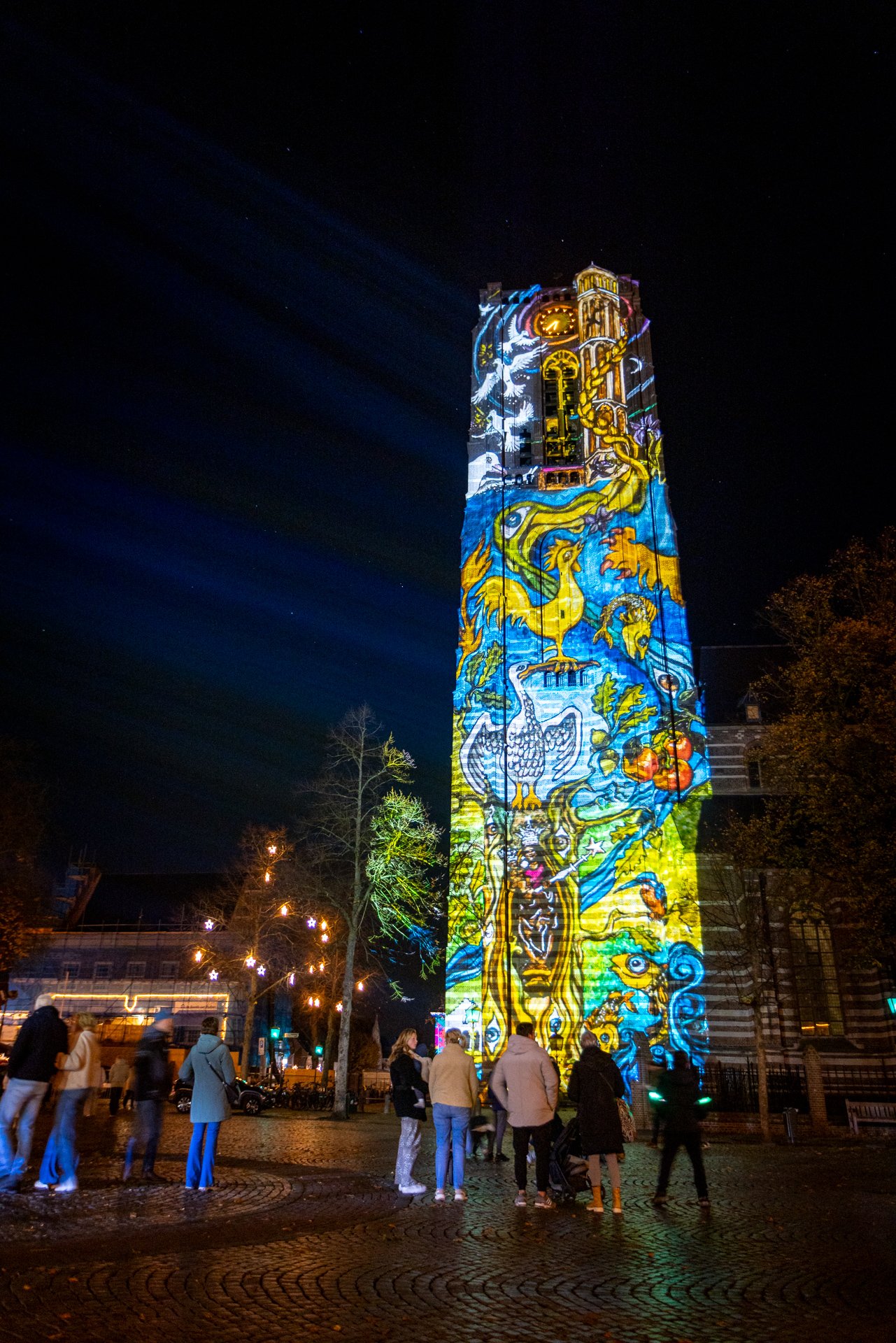 De Oirschotse kunstenaar Maartje Meerman maakte deze dubbelanaloge (pani)projectie speciaal voor GLOW. Ze schilderde de afbeelding op een glasplaatje. Het resultaat zie je hier nu voor je, in megaformaat geprojecteerd op de toren van de St.-Petrusbasiliek. Voor de kunstenaar waren de betekenis van licht en de toren als verbinding tussen hemel en aarde inspiratiebronnen voor de projectie. Maar het verhaal staat niet vast: de kunstenaar nodigt jou als bezoeker uit om er je eigen betekenis aan te geven. Dat past mooi in het straatje van GLOW. We kunnen niet zonder onze bezoekers en de wensen, gedachten en verhalen die zij bij de lichtinstallaties maken. Samen maken we GLOW. Wat betekent dit werk voor jou?