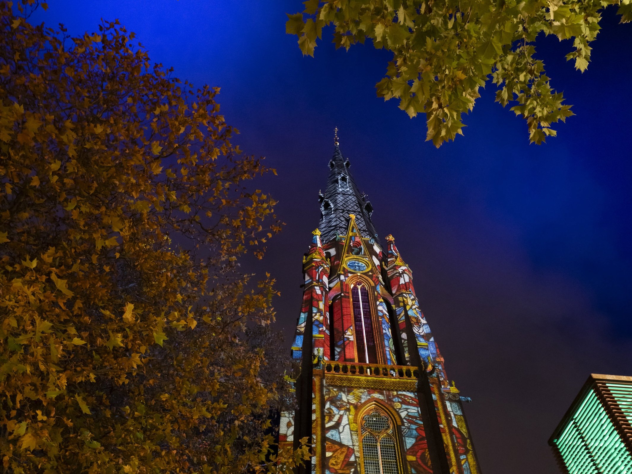 Kunstenaar Daniël Margraf nam deze ramen als basis voor het lichtkunstwerk Windows, dat ook al in 2017 op GLOW te zien was. Het is een ode aan de prachtige ramen, waar tijdens de Tweede Wereldoorlog het kleurrijke glas uit werd geblazen. Gelukkig zijn de ramen opnieuw ontworpen tijdens de kerkreconstructie tussen 1945 en 1961. Het zijn de ramen die je vandaag de dag nog steeds ziet. Ze herinneren aan een opkrabbelend Nederland, na zware tijden. En ze verwijzen naar alle verhalen die deze kerk herbergt.