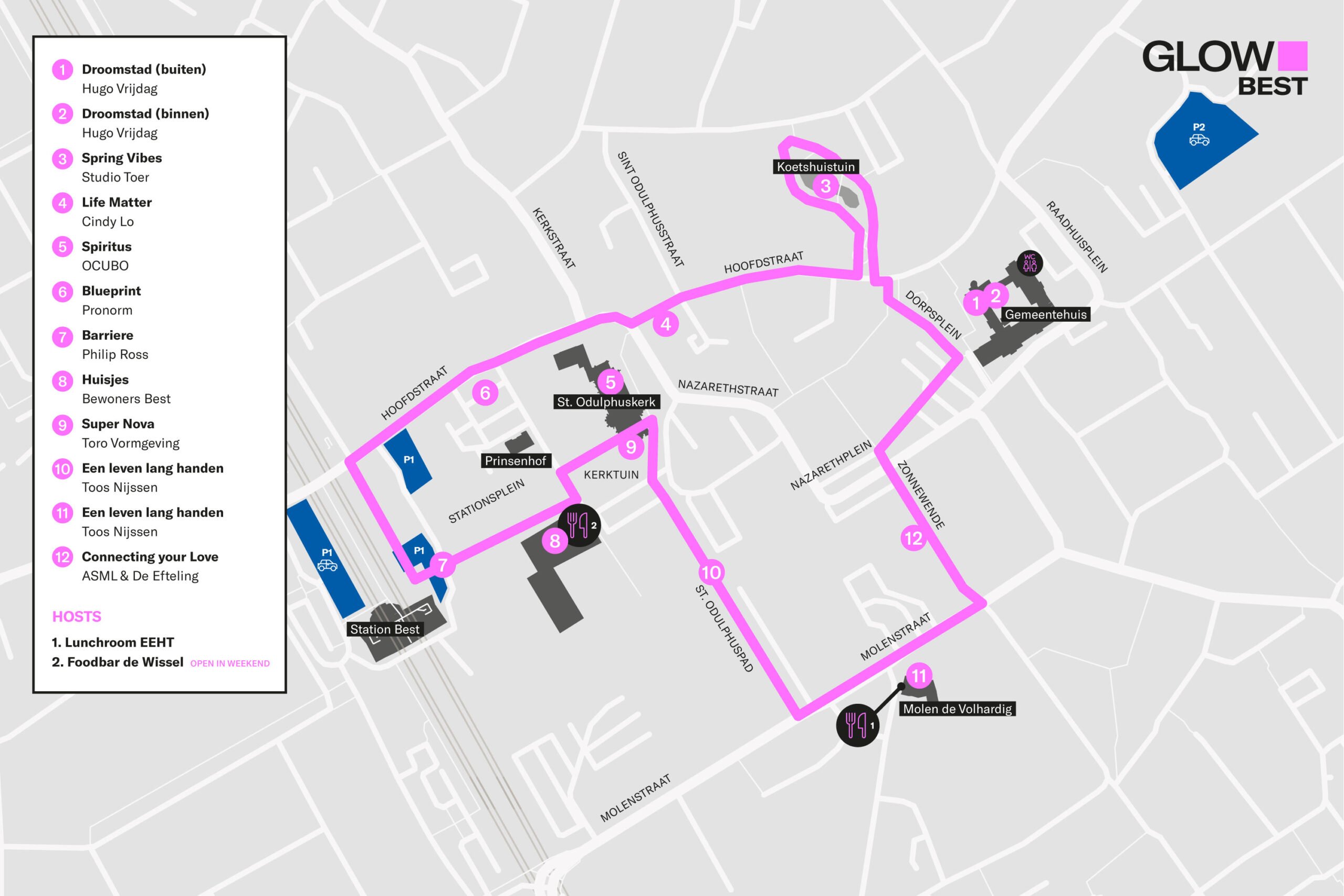 In Best bewonder je lichtkunst op pleinen, plantsoenen en verborgen in de straten op onverwachte plekken. De route is een plek waar mensen samenkomen en ervaringen delen. Van jong tot oud, nationaal of internationaal, GLOW zorgt voor gedeelde momenten en herinneringen. Wandel zo’n drie kilometer langs twaalf lichtkunstwerken, gecreëerd door internationale en lokale kunstenaars, speciaal voor én door bewoners en bezoekers.