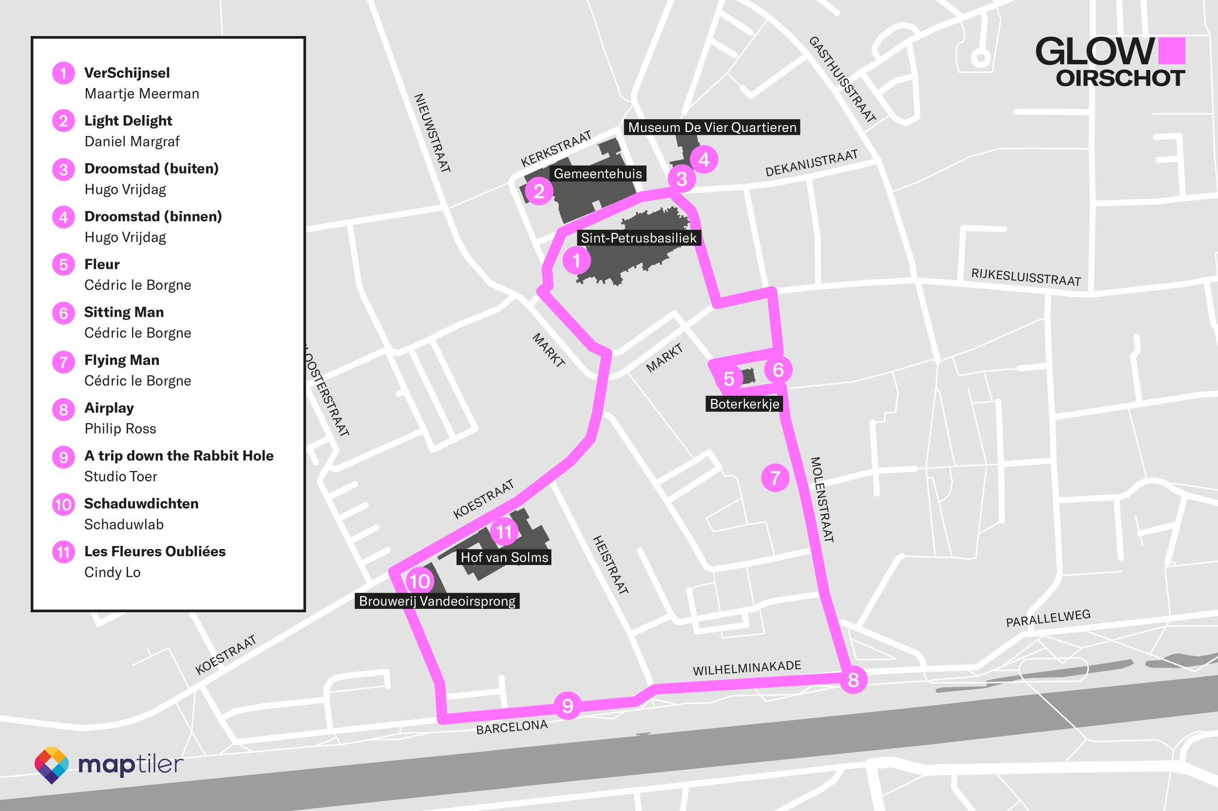 In het hart van Oirschot bewonder je lichtkunst op gebouwen vol rijke historie en cultureel erfgoed beleeft in een nieuw licht. De route is een plek waar mensen samenkomen en ervaringen delen. Van jong tot oud, nationaal of internationaal, GLOW zorgt voor gedeelde momenten en herinneringen. Wandel zo’n drie kilometer langs twaalf lichtkunstwerken, gecreëerd door internationale en lokale kunstenaars, speciaal voor én door bewoners en bezoekers.