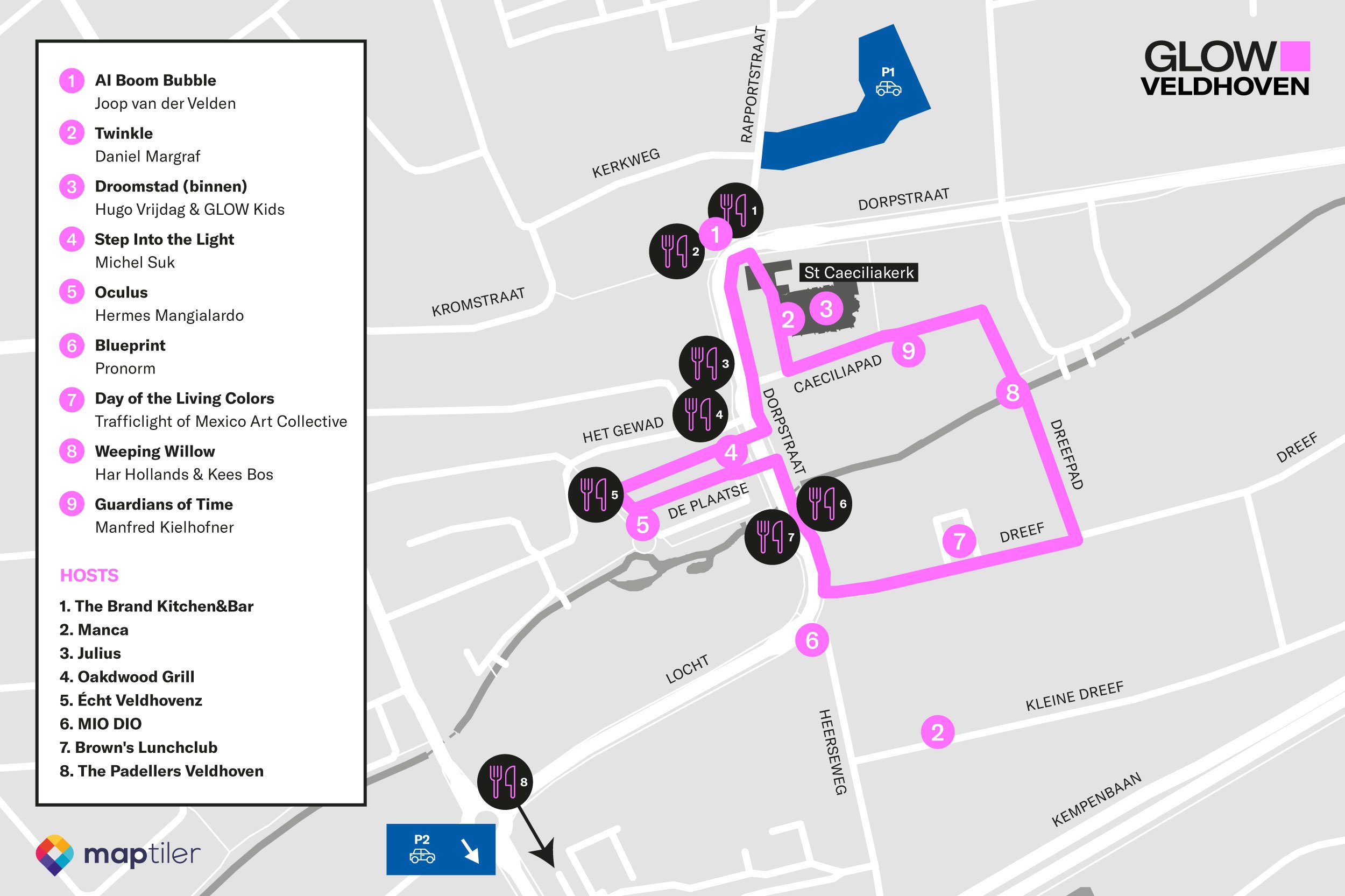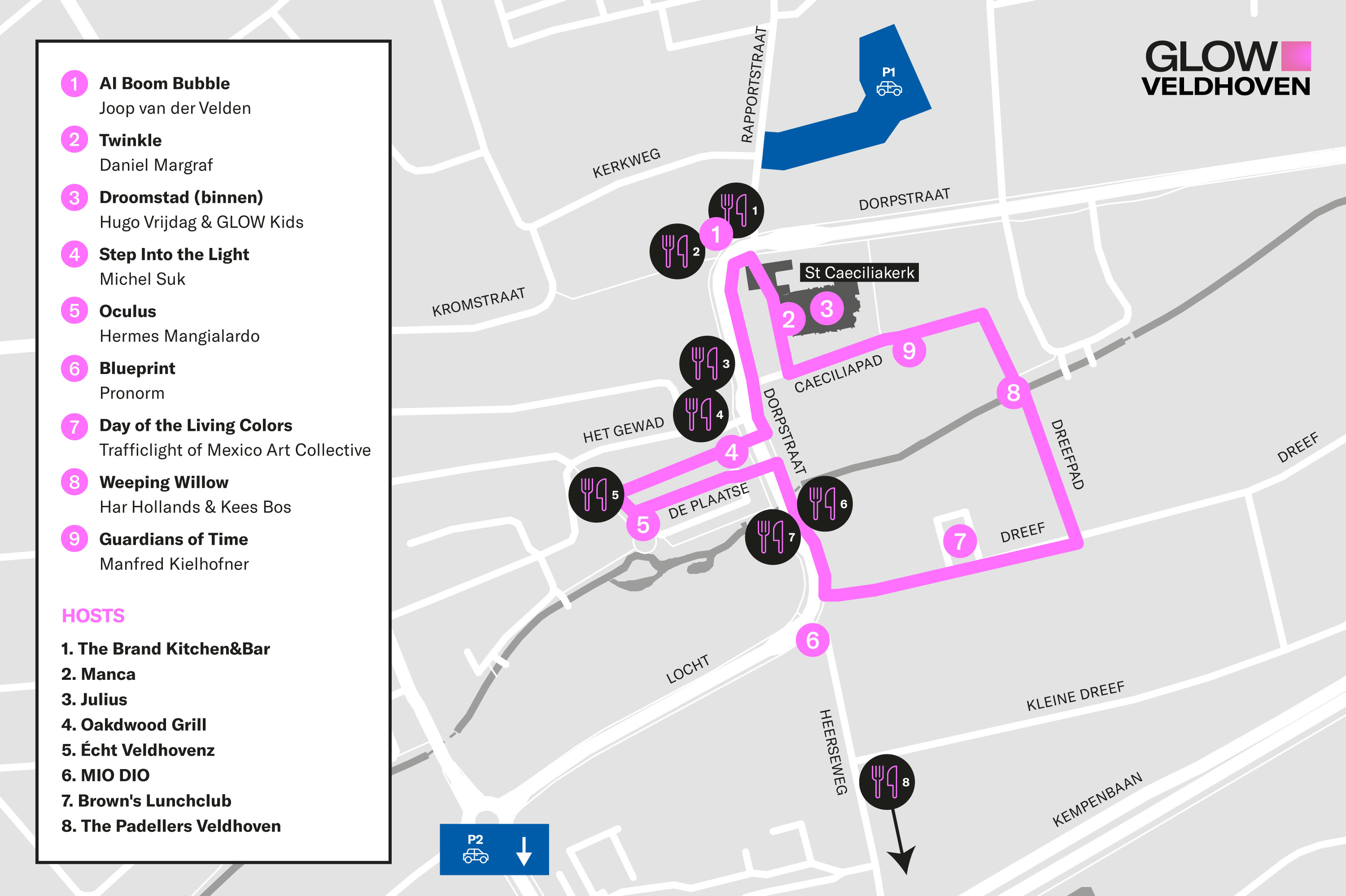 Tijdens de eerste editie van GLOW verandert Veldhoven in een betoverend lichtdecor, waar je op onverwachte plekken, pleinen en straten de mooiste lichtkunstwerken ontdekt. De route is een plek waar mensen samenkomen en ervaringen delen. Van jong tot oud, nationaal of internationaal, GLOW zorgt voor gedeelde momenten en herinneringen. Wandel langs een aantal lichtkunstwerken die gecreëerd zijn door internationale en lokale kunstenaars, speciaal voor én door bewoners en bezoekers.